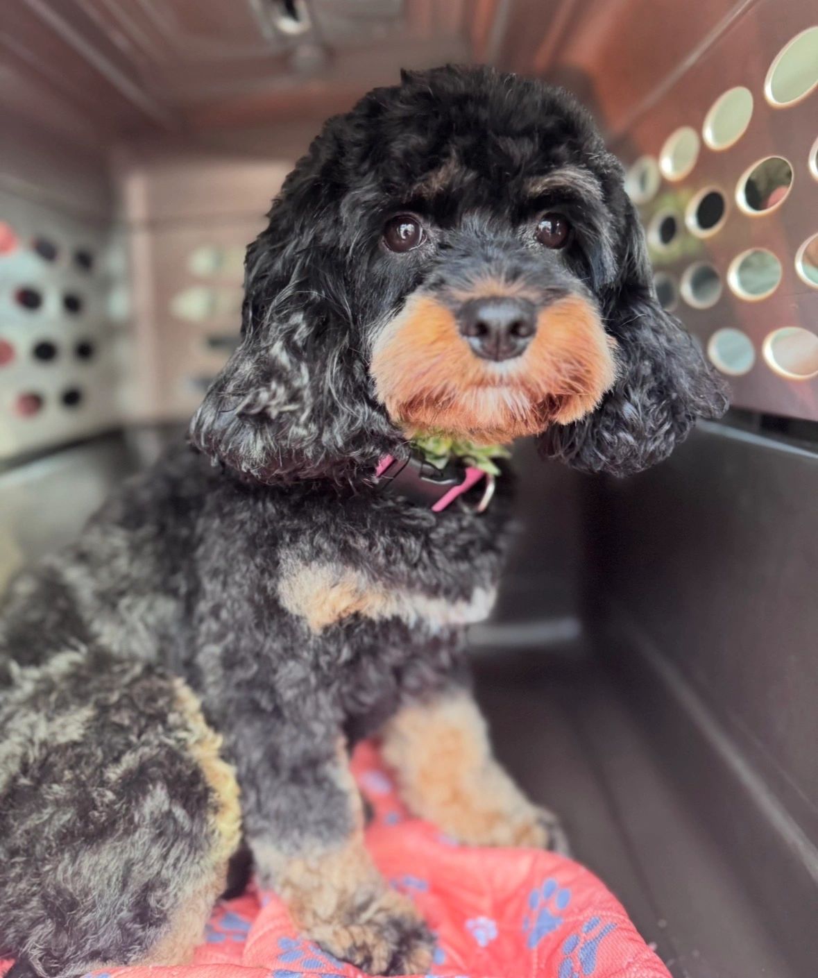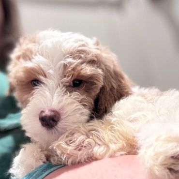 Hi! My name is Raven. I’m an F1 Cavapoo and I weigh 17 pounds. I’m the mama to these sweet puppies!